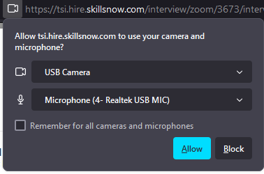 ⚠️ Known Issue: When first giving permission to your devices in firefox, your devices options will still be empty. In this case, leave the Interview lobby by clicking Cancel then re-join to show your devices correctly.