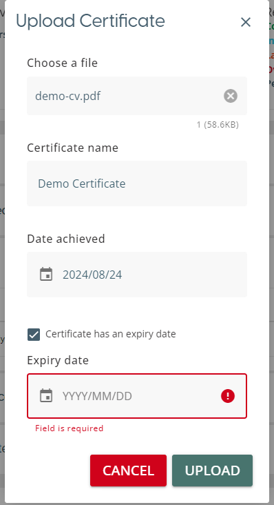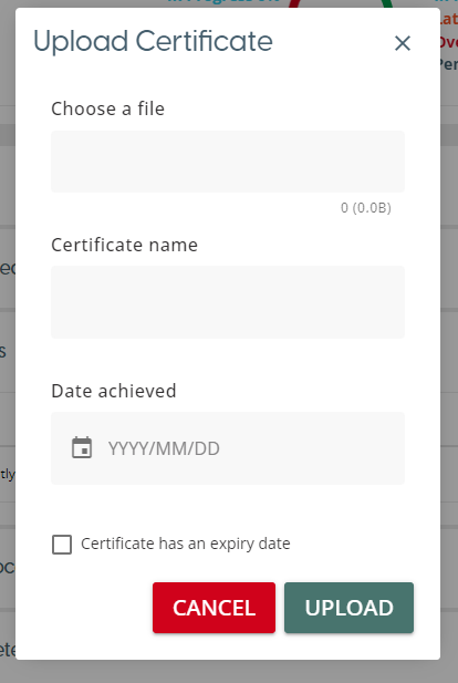 Clicking on this will open the Certificate Upload dialog. Clicking on the 'Choose a File' section will allow you to select a file from your device to upload. You must also add a Name and Date Achieved in order to upload the document.