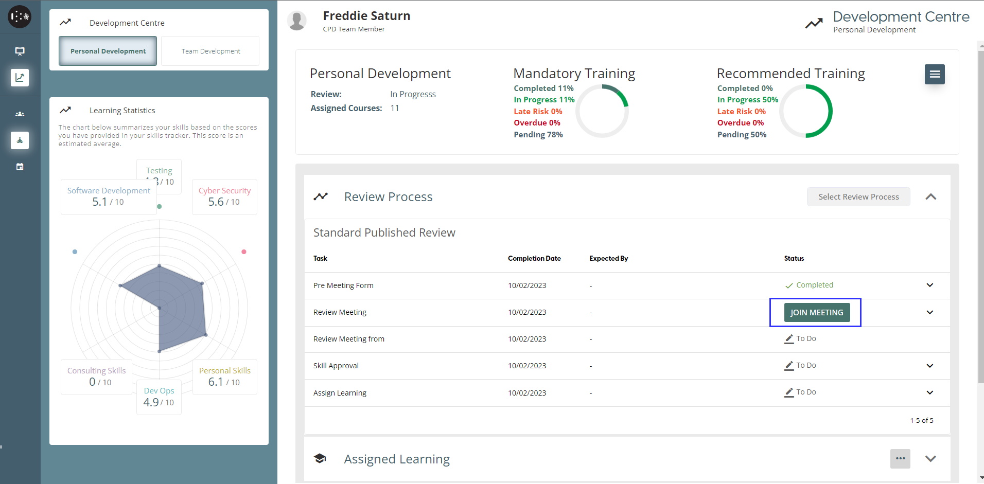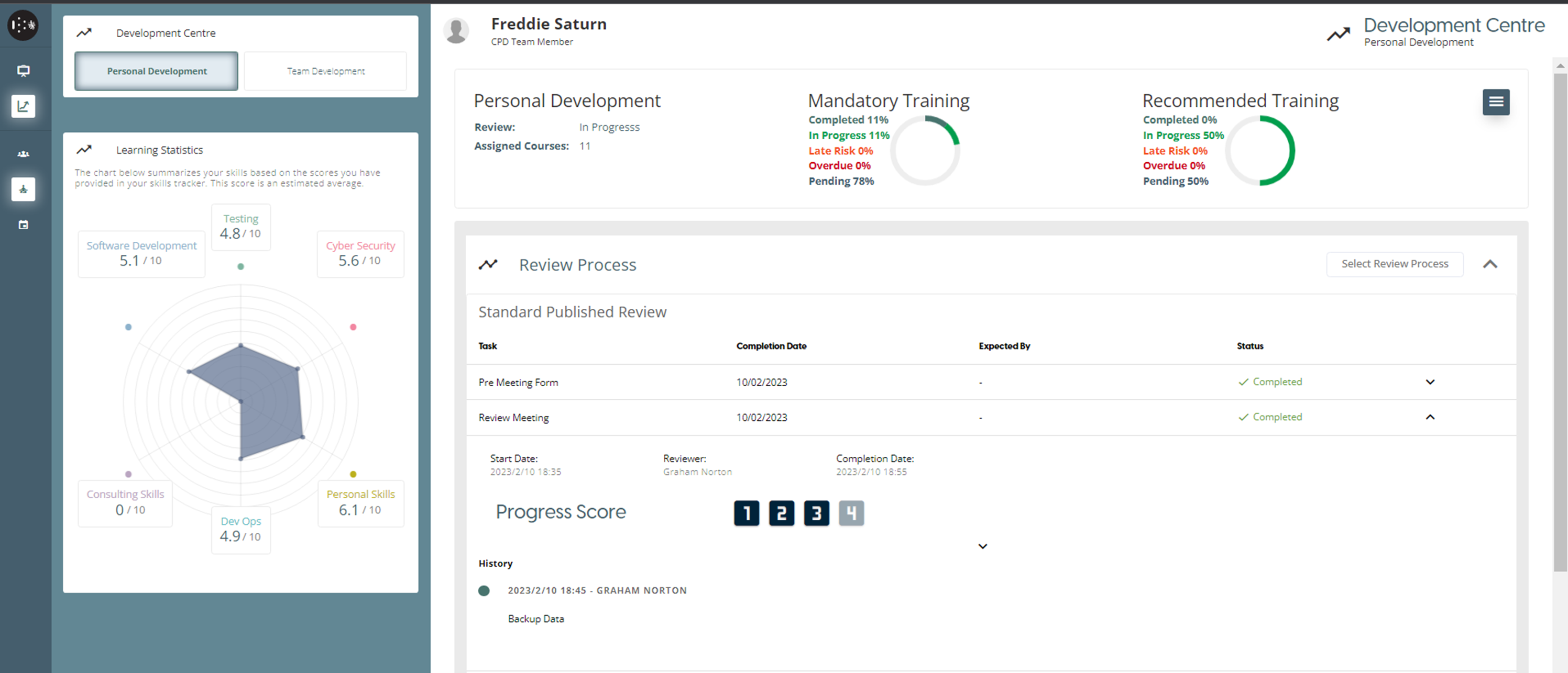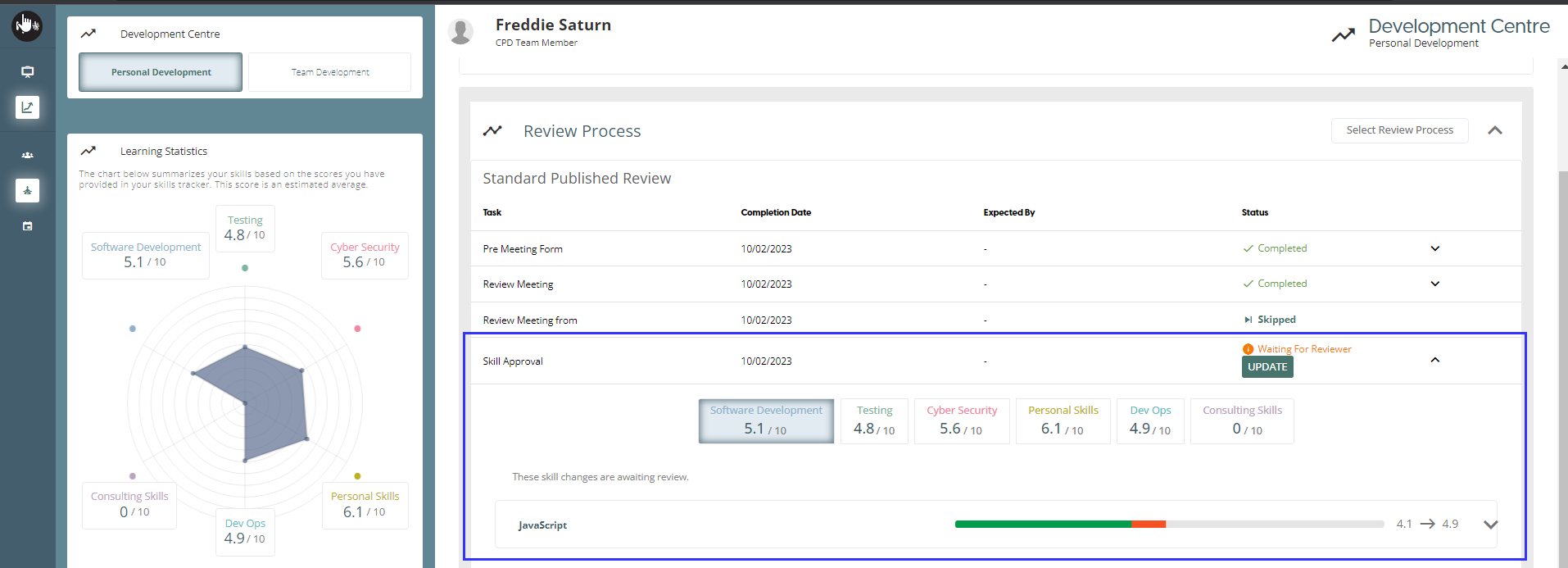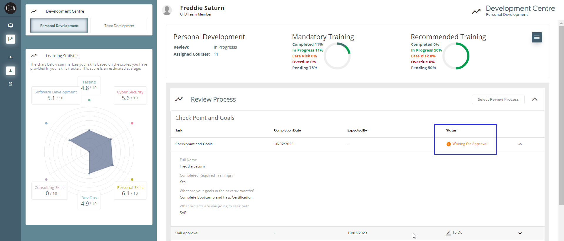 On the Personal Development page, the user can document their new skills. Once they have acquired a new skill, they can list it on this page and provide a rating for it between 1 and 10, and also record any sub-skills. Any new skills and the scores will be presented in the Learning Statistics graph. When a user’s task in the Review Process is a “Skill Review”, added skills by the user will be sent to Reviewer for Approval.