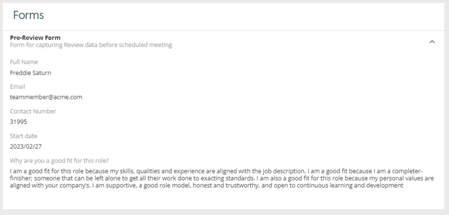 team member’s submissions are displayed for the current review meeting by expanding the element