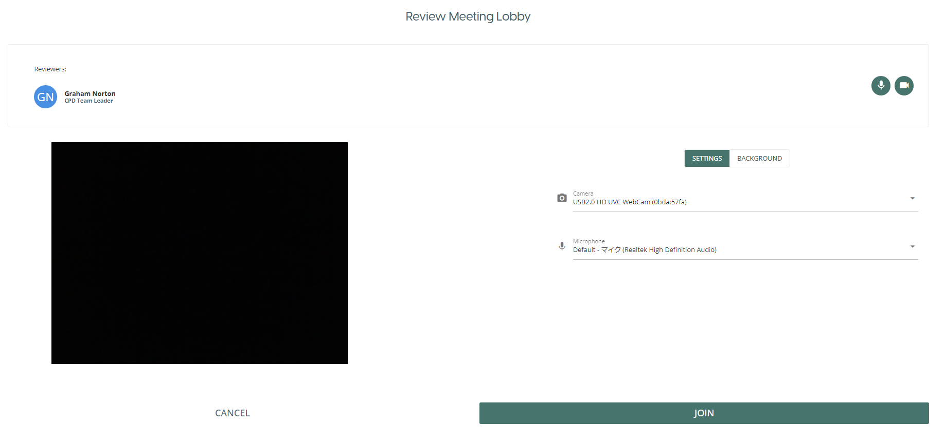 The review meeting lobby provides options to the participant before joining the meeting.