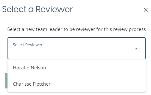 Clicking on the button will open a pop-up window that will allow a new team leader to be assigned. Valid team leaders will appear in the dropdown list. Once the choice has been confirmed, then the old reviewer is replaced with the new reviewer. This allows the new reviewer to continue the review process and schedule any new review meetings.