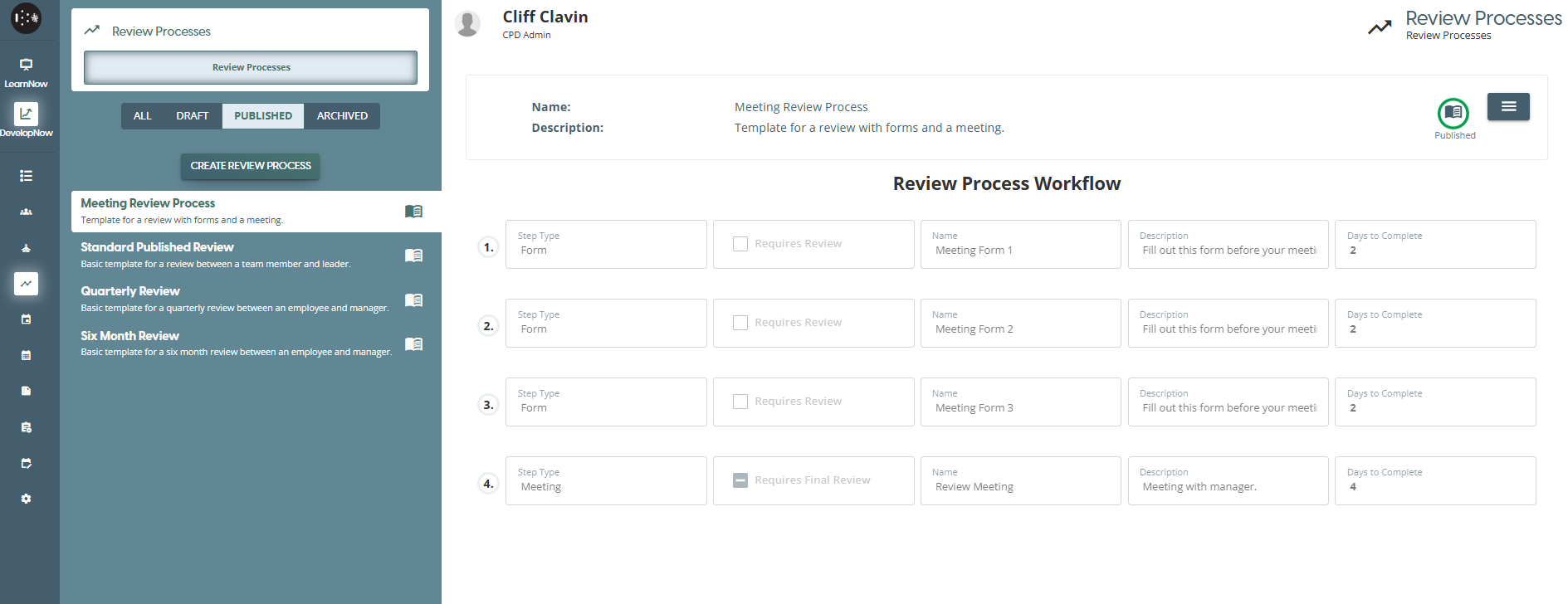 Created Review Process Workflow will be listed on the PUBLISHED tab and will be already for use for Team Review - Review Process. These Review Processes can now be selected to each team member when assigning a new review process.