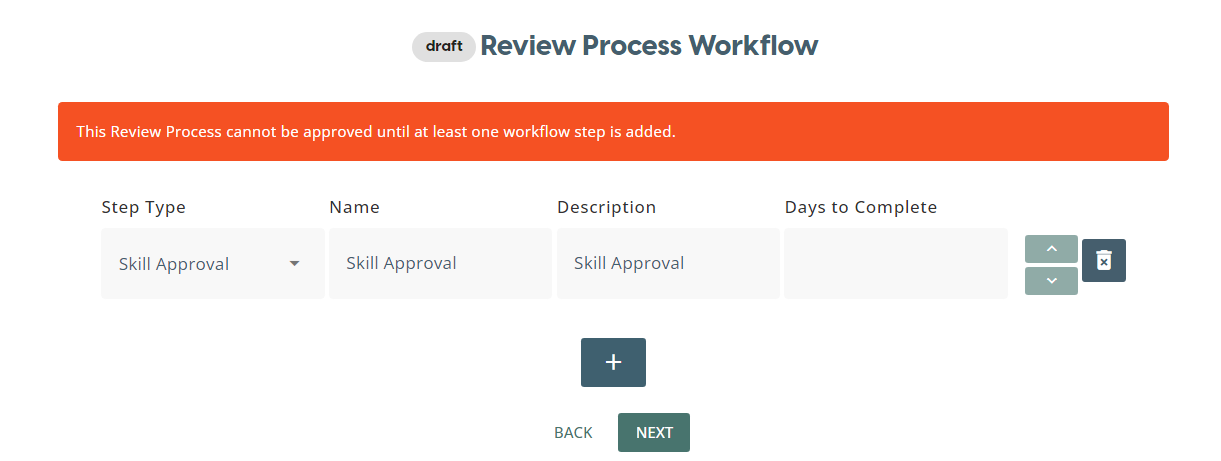The first step to creating a Review Process is to give it a Name and Description. After clicking one of the buttons to build a review process, this is the first page you will land on. Once you have confirmed these details, click on the Next button to create the workflow for your Review Process.