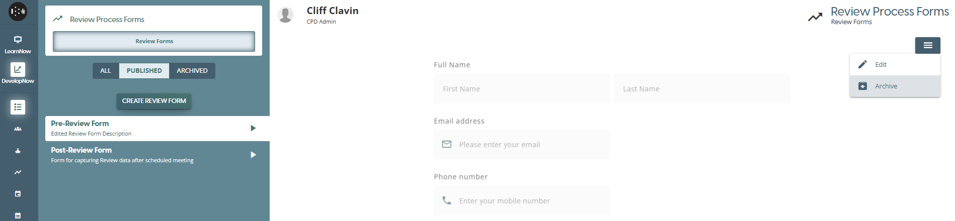 From the Review Forms page, select a Review form in the published state from the left panel. Once you have selected one, click on the burger menu and select Archive.