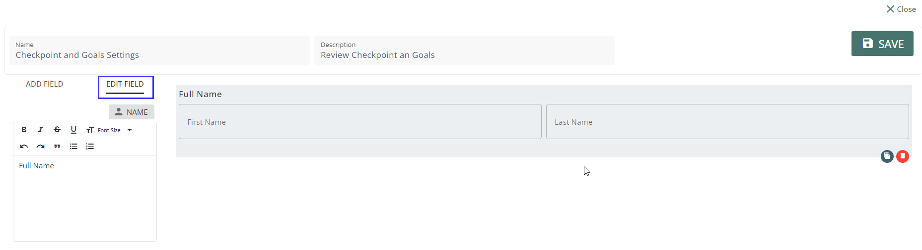 Once you you have inserted an element, you can edit the details via the 'Edit Field' tab. The options available will differ from element to element. You can also click on the bin icon to delete the element, or the copy icon to create a duplicate of the element in it's current state.
