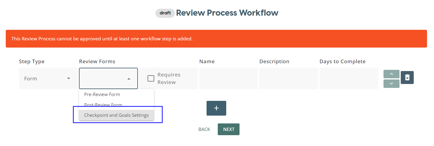 During Review Process creation, users can select which review form they would like the team member to complete as part of their review process. The creation of these forms is done on the Review Forms page.