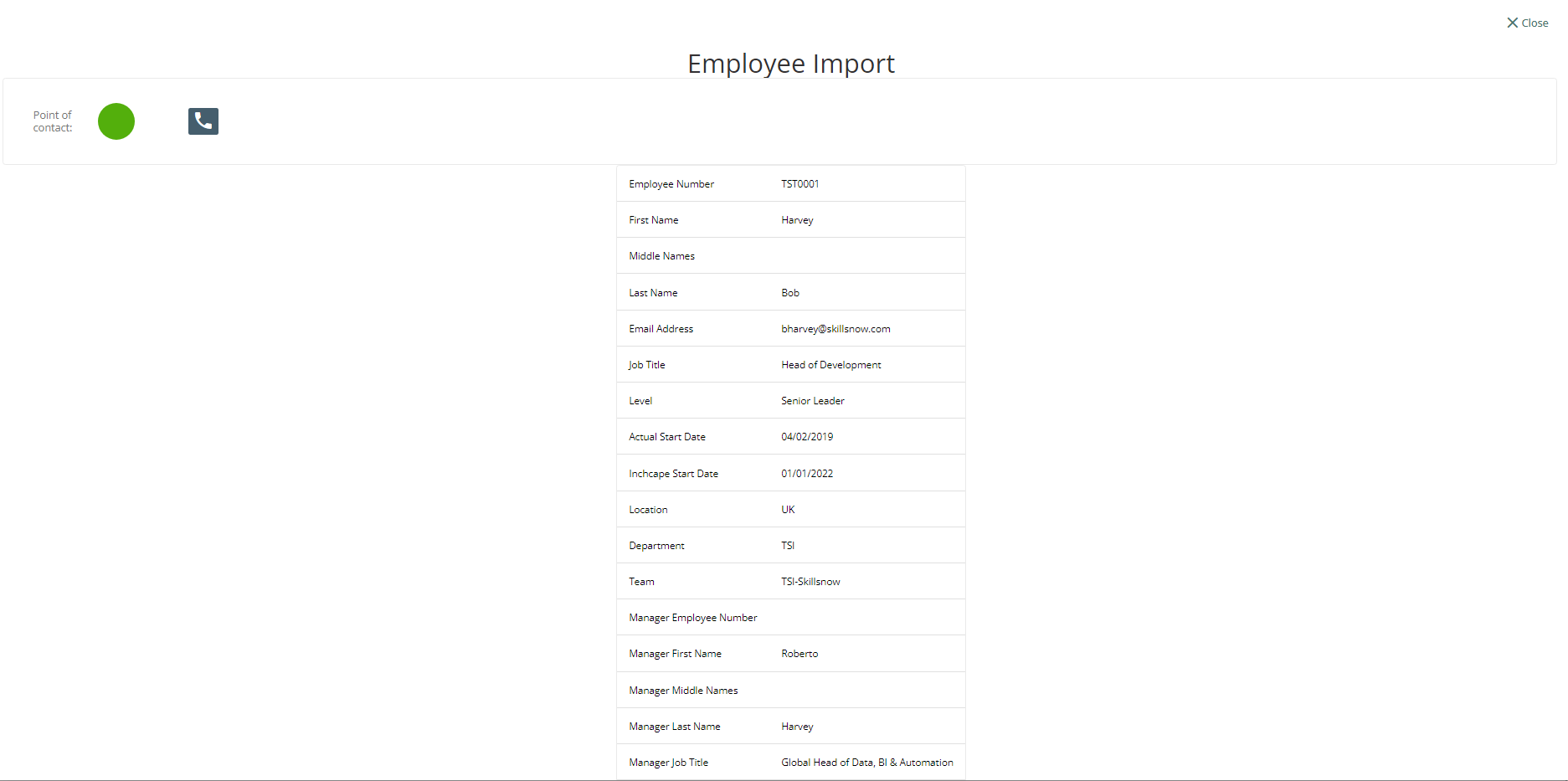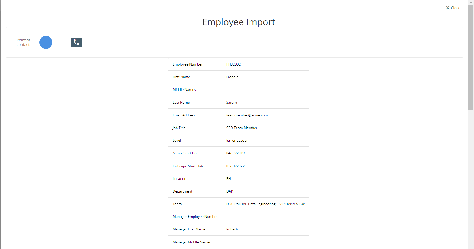 When the Team Leader clicks the Field Set Label (Employee Import), the data associated to the selected team member will be displayed on the screen.