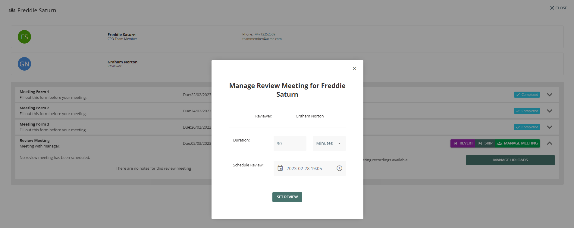 A pop-up will display the option to set the Schedule Review Date, Time, and Duration.