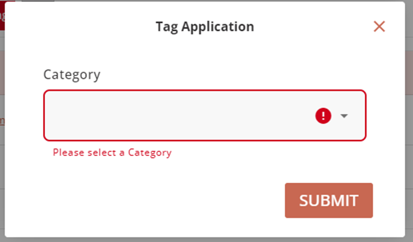 After selecting a category, two new options will appear in the window. The ‘Tag’ dropdown list will provide a list of available tags to the user. Selecting one from the list and pressing the ‘Submit’ button will attach the selected tag to the application.