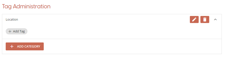 Once the user clicks save, the tag category will be put into the Tag Administration section. Once there is a category in the table, clicking on the pencil icon will bring up a dialog which lets the user re-name the category, while the bin icon will delete the category. However, a tag category can only be deleted if there are no tags associated with that category, and the bin icon will remain disabled until this condition is met.