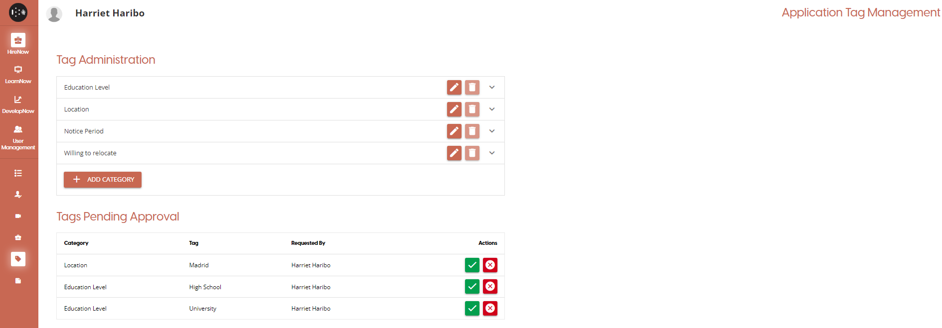 The first step in being able to add Tags to an application involves creating Tag Categories. These allow for tags to be grouped up for better searching and filtering. The recruitment admin will have a new Icon in HireNow that will take them to the Application Tag Management page.