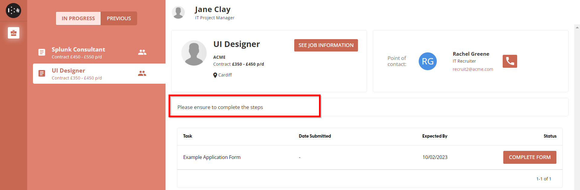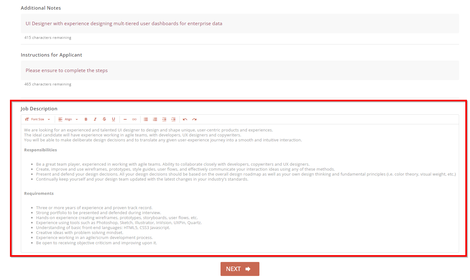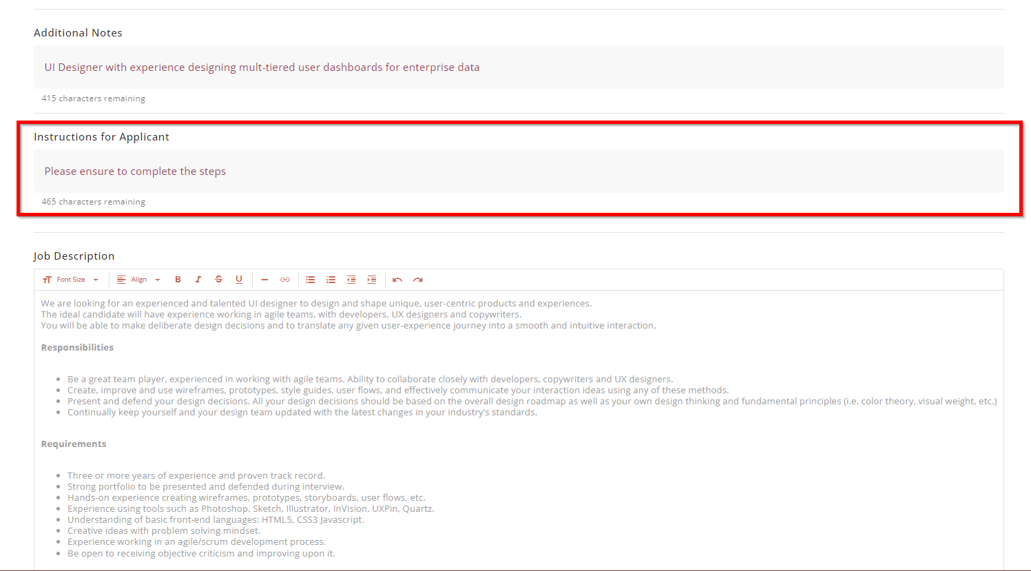 This rich text field can be used to provide full details of the job description for this campaign. It is displayed to both the applicant and the recruiter through the Applicant Dashboard.