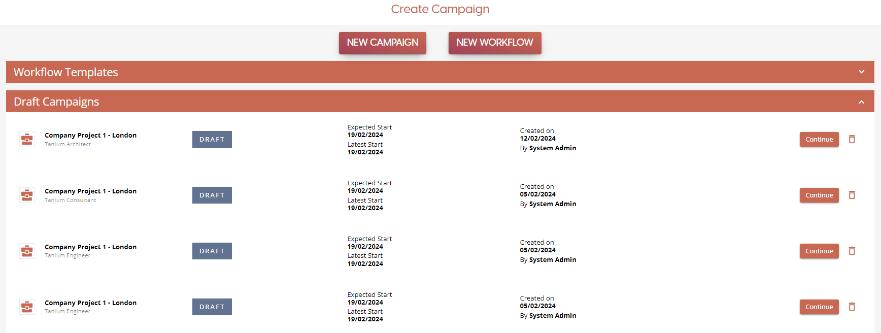 If you have previously started a creating a campaign, a list of campaigns in the draft state can be seen by expanding the 'Draft Campaigns' section. To carry on with the campaign configuration, click on the 'Continue' button to continue from the Campaigns Settings page. If you wish to delete any of the campaigns in the draft list, click on the Bin icon instead to permanently delete the campaign.