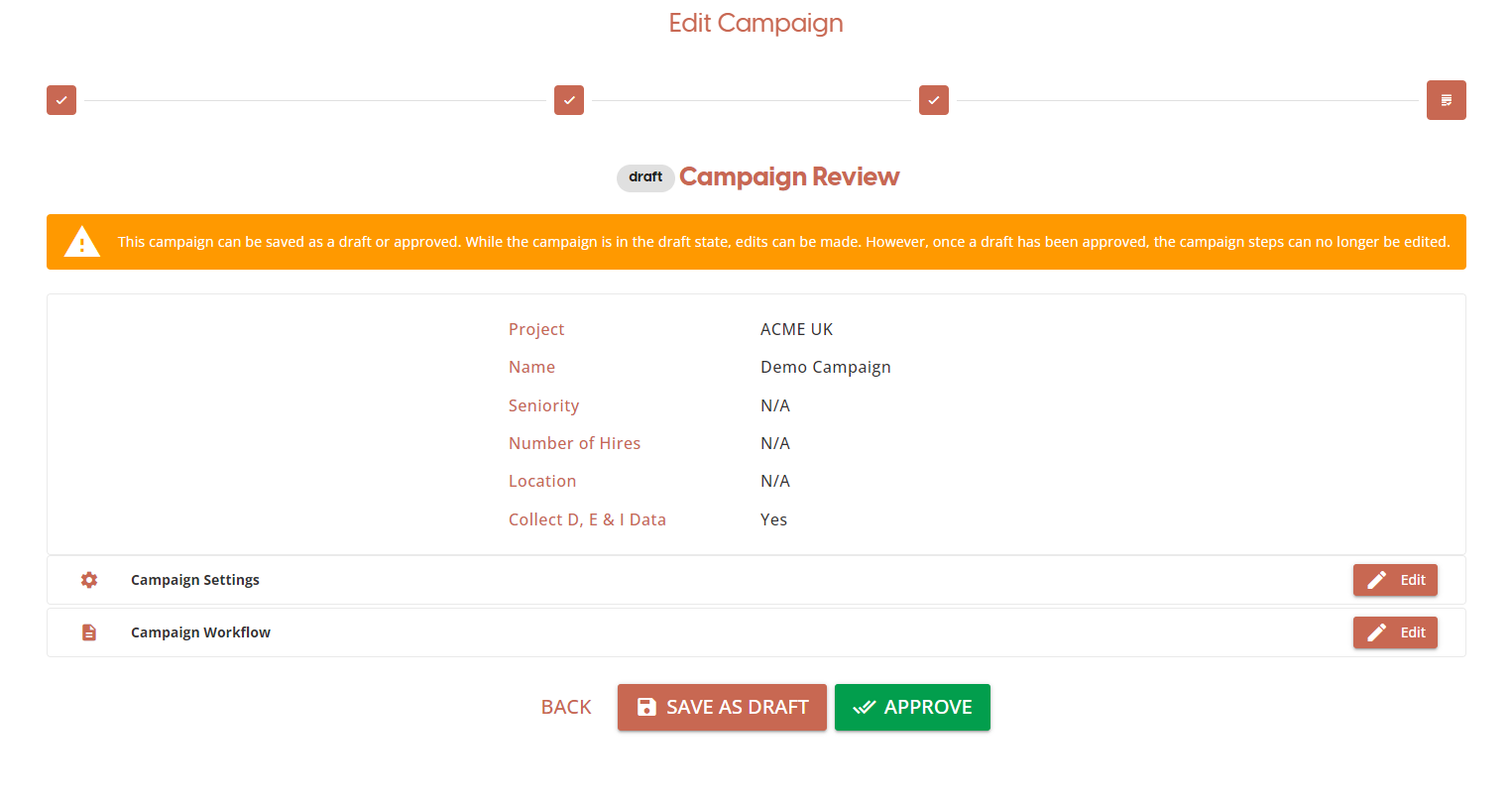 At the review stage you can edit any of the previous configuration steps and choose to “Save as Draft” or “Approve” the current campaign. Approving the campaign will make the job listing live and allow the recruiter to share a link with prospective candidates to enable them to start the process.