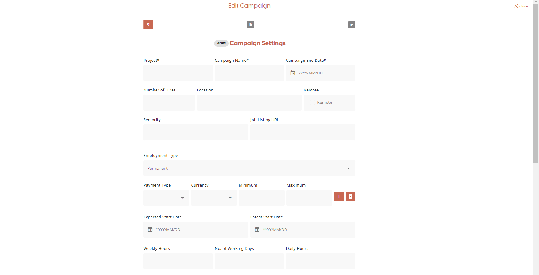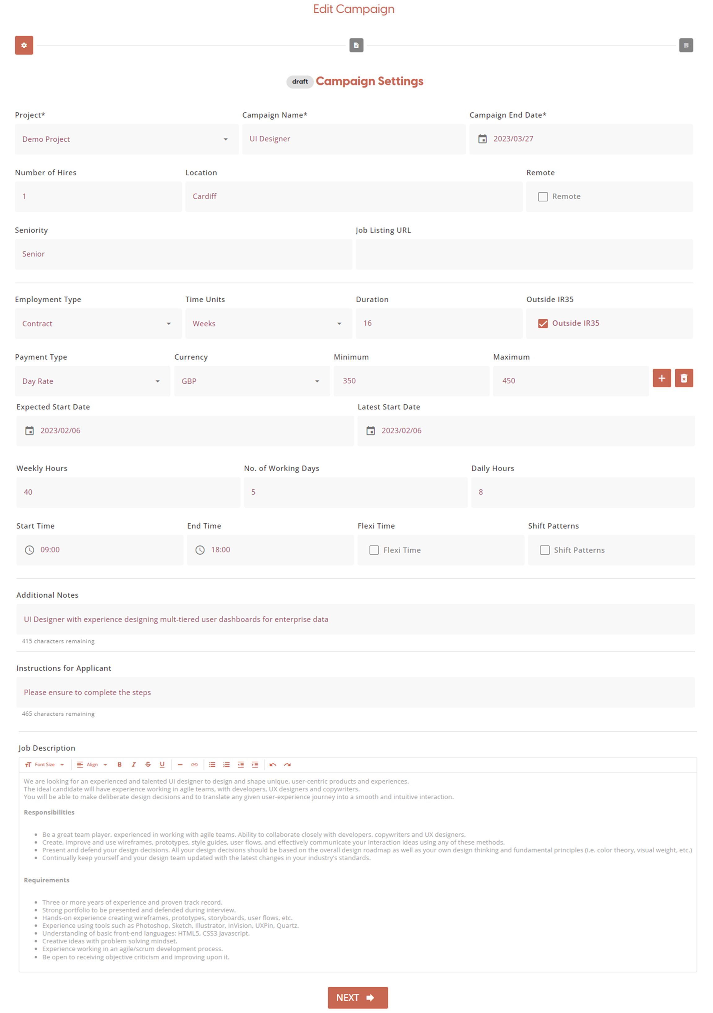 On the Campaign Settings page you can enter a range of details relating to the job listing you are configuring for applicants to apply for.