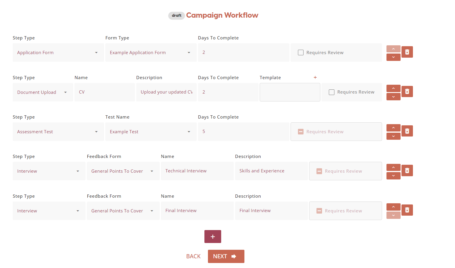 Recruiters can change the order of a campaign workflow by selecting the upwards/downwards arrows. Recruiters can also remove a workflow step by selecting the blue bin icon. To add another Campaign Workflow Step, you can click the '+' at the bottom of the list of the current campaign steps.