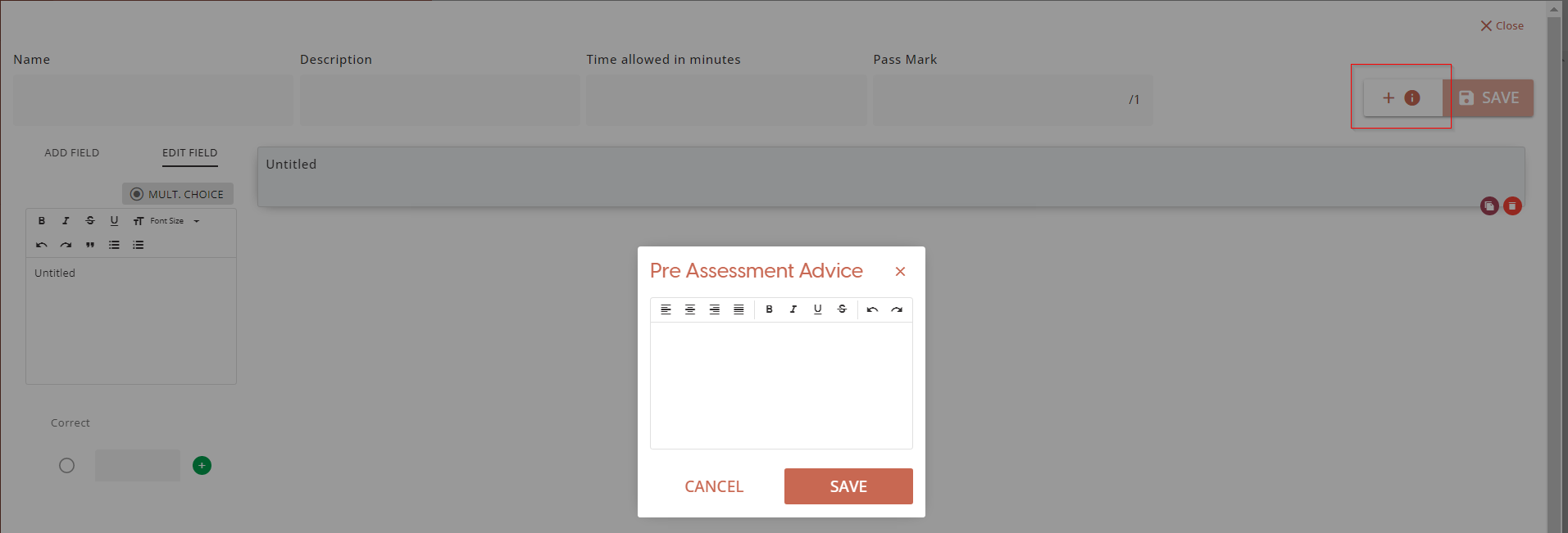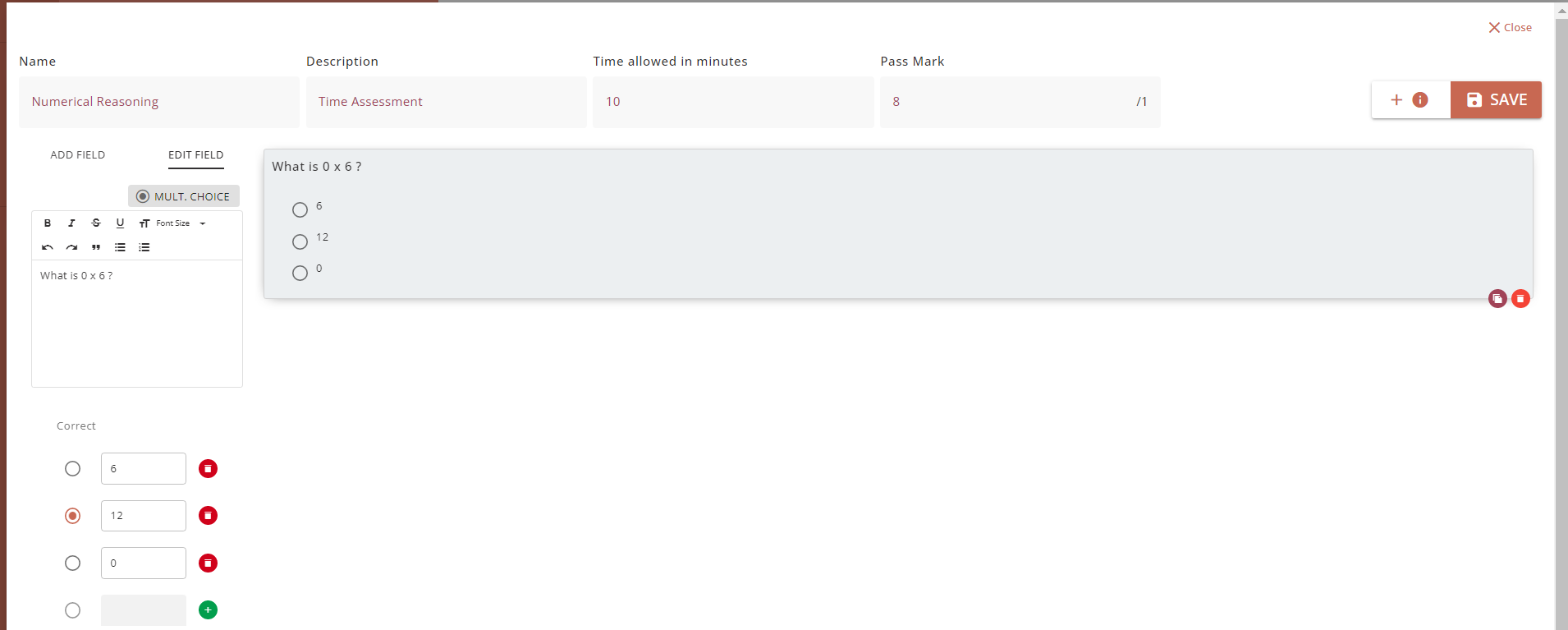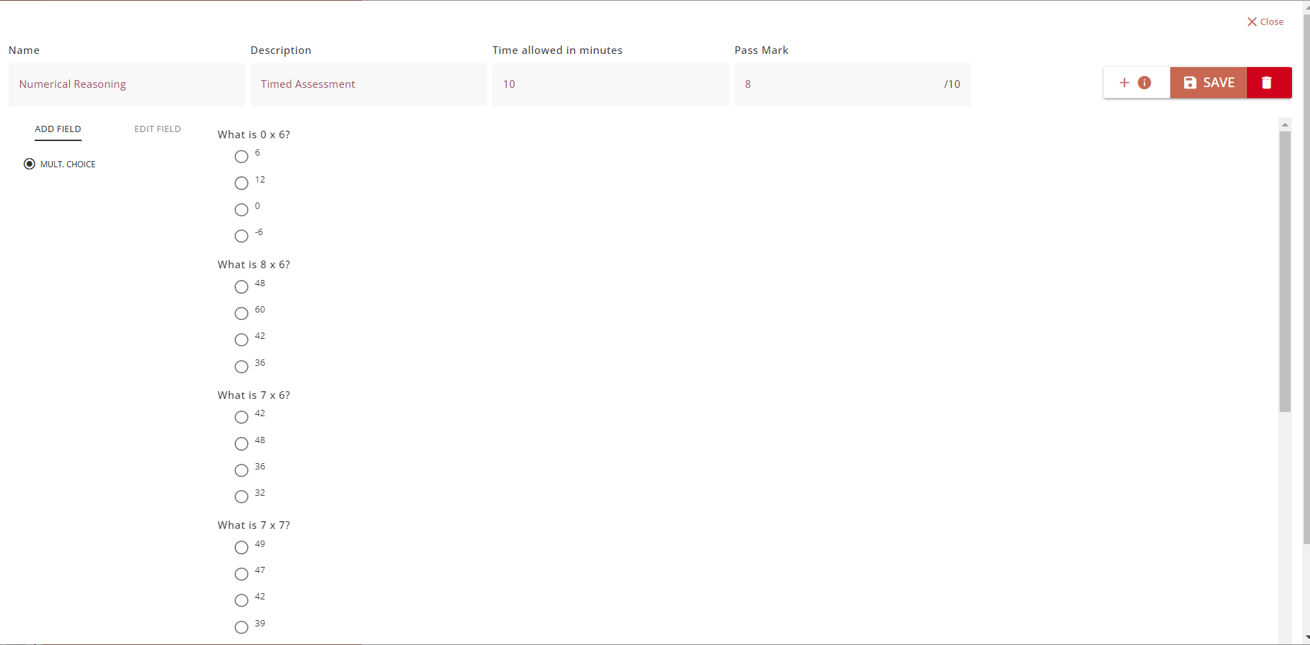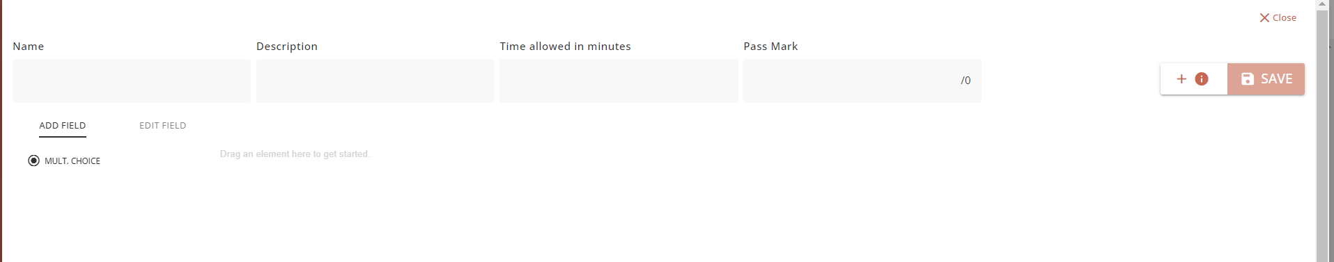 To add a field in the assessment form, select ‘ADD FIELD’ and enter in the text box a test question you would like to include.