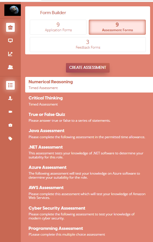 Click on ‘CREATE ASSESSMENT’ to create a new assessment form. The assessments are a collection of completly custom multiple choice questions.
