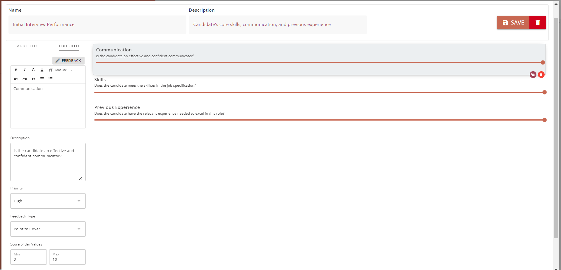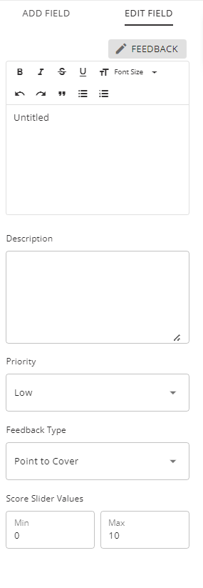 They can add fields for the feedback form by selecting ‘ADD FIELD’. All of the fields for a feedback form include a feedback slider where they can select the scale on which they will measure each feedback point. By default, the sliders are set at 0-10.