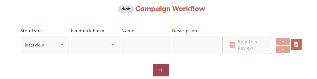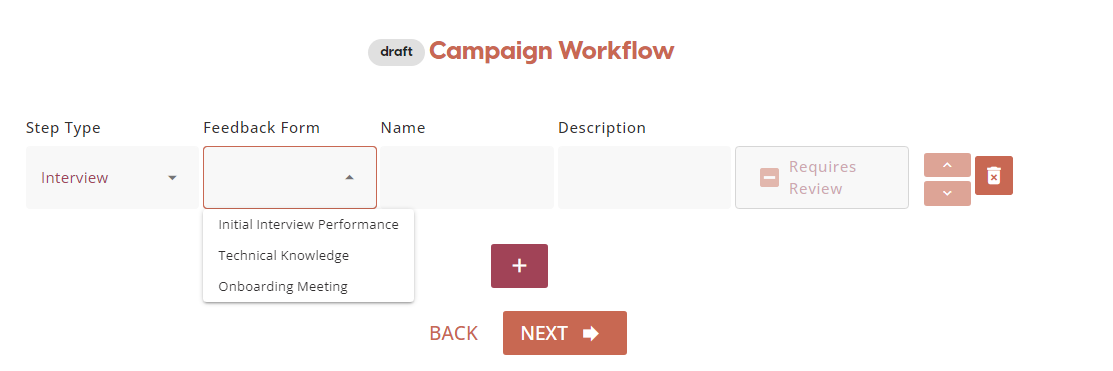 The final workflow step available for campaigns is an interview. The recruiter can fill out the name of the interview and a description of what will be covered during the interview. All interviews require review for the applicants to progress in their application. Depending on the campaign and the type of interview the recruiter would like to organise, they can create and select a feedback form to be completed in each individual interview step.