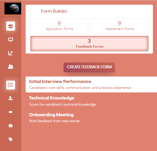 To create an interview feedback form or to edit an existing feedback form, the recruiter can go onto the Recruitment Form Builder page, then select the Feedback Forms tab.