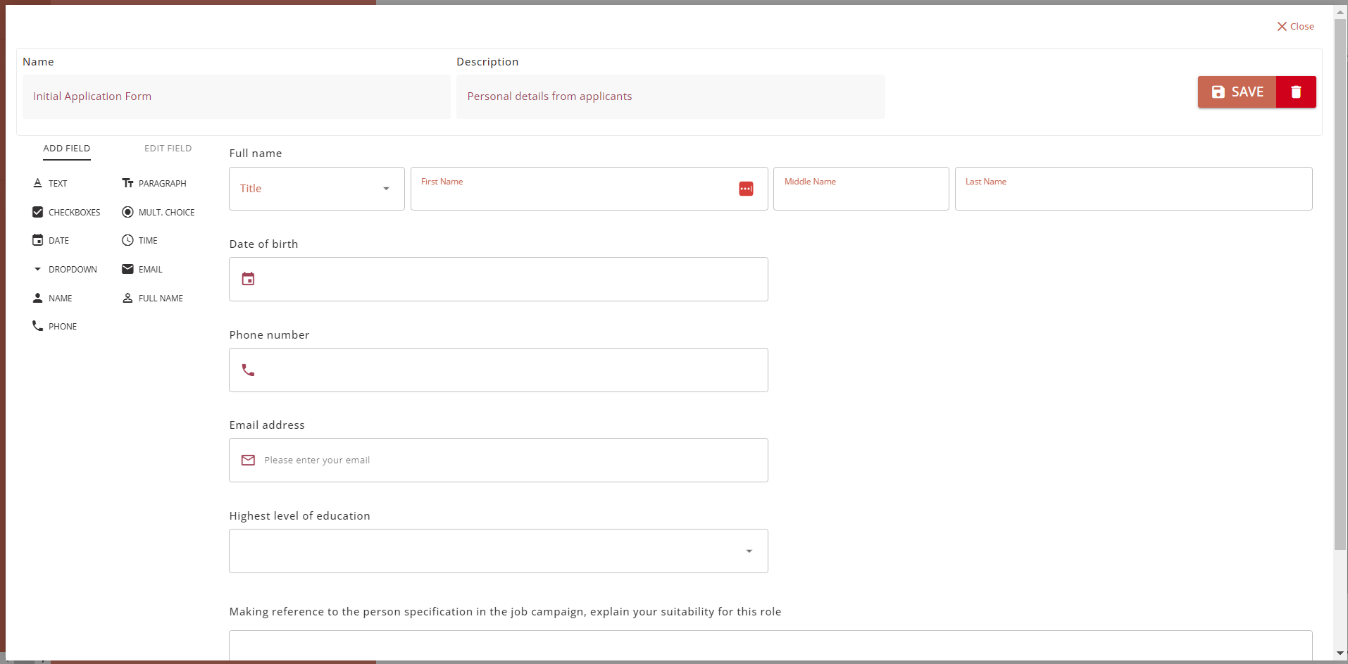 In the form builder, recruiters can insert a variety of different form elements including checkboxes, multiple choice or a date selector.