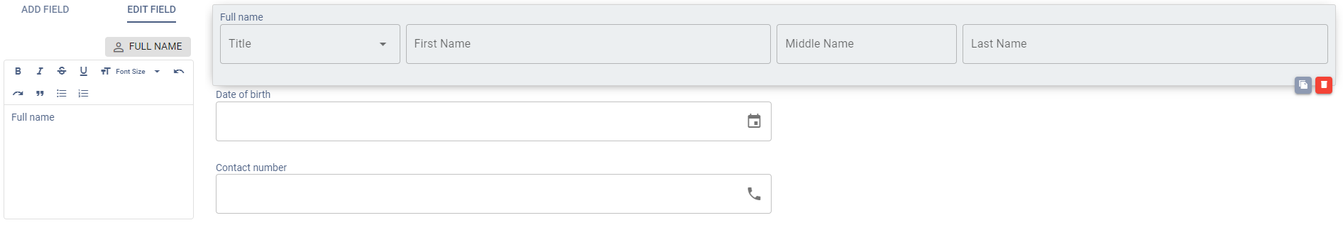 When you have a form element selected, you can either copy the form element by clicking on the 'Copy Field' icon or delete it by clicking on the 'Delete Field' icon.