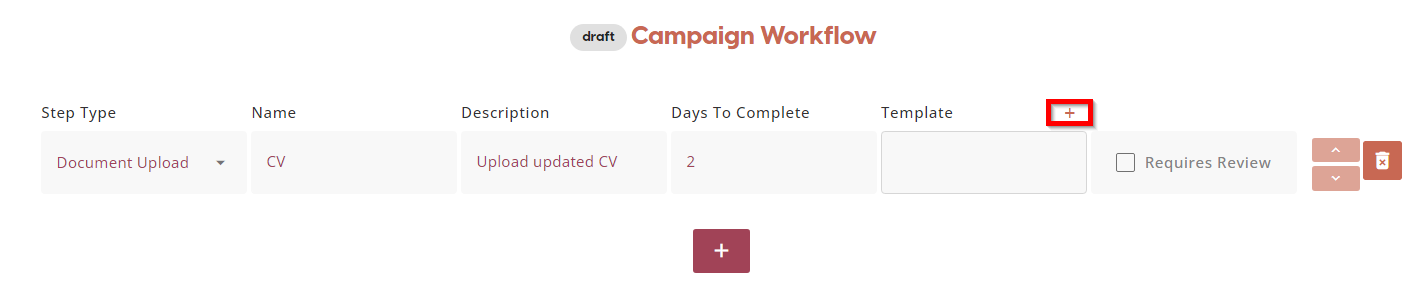 Fill out the Document Upload workflow details, then select the '+' in the Template box.