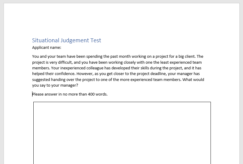 In this step, applicants are able to upload a wide range of different files. Examples of uses for this step include uploading a CV/resume, a cover letter, or a completed document template. Once they have uploaded their document, the recruiter can review their file to see if they would like to progress the applicant to the next stage.