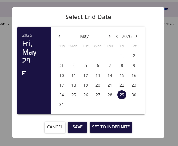To select a date, click on the desired date and click on Save. If you wish to discard any changes you may have made and close the dialog, click on cancel. If you wish to give the user permanent access to Learning Zone, click on the Set to Indefinite option.