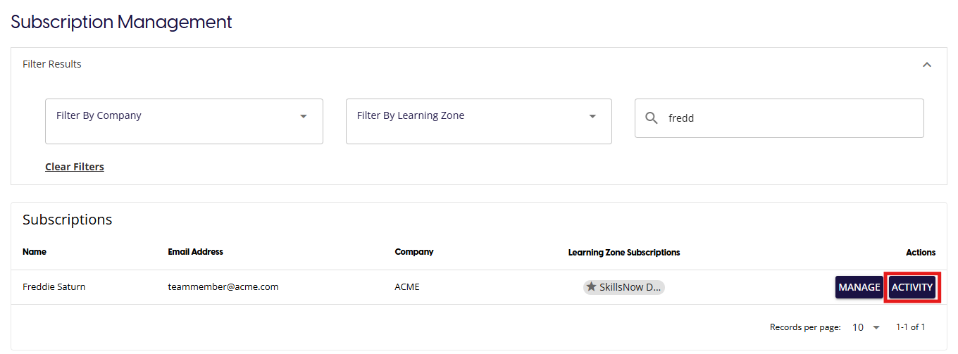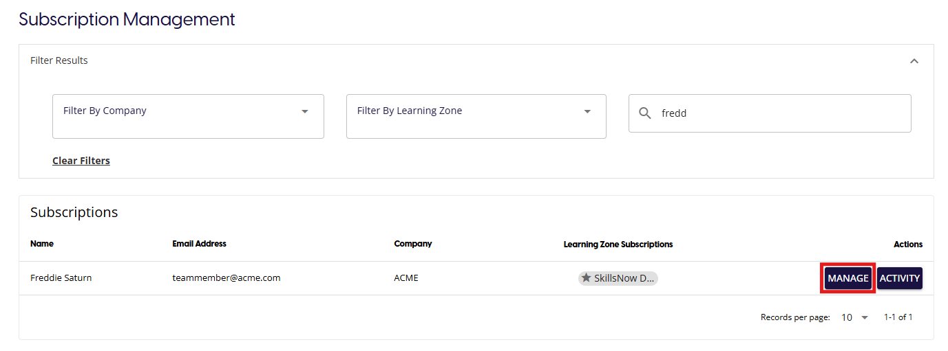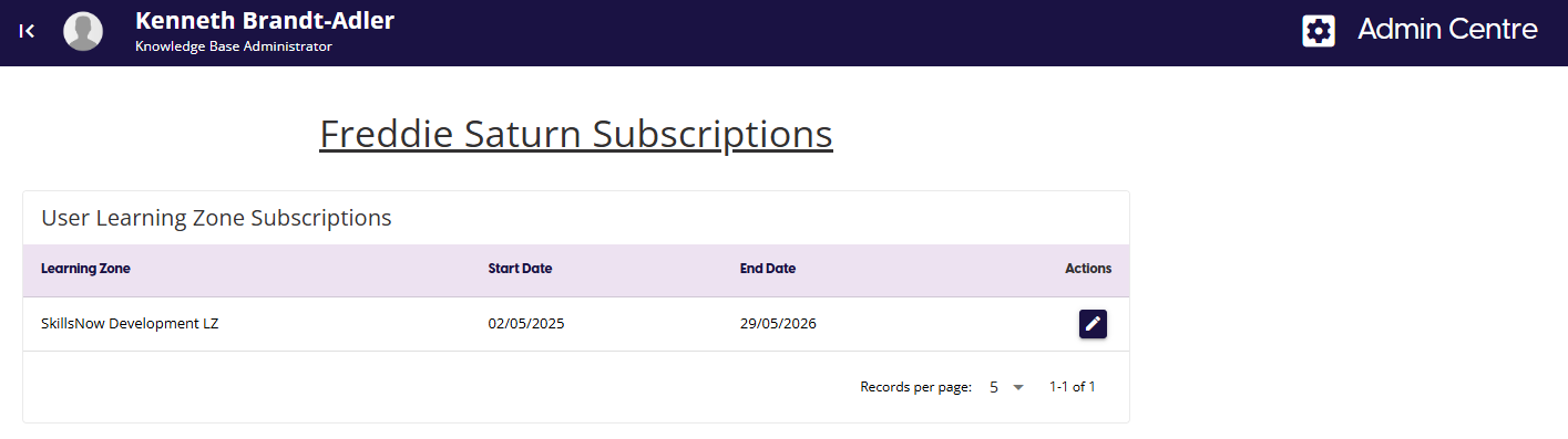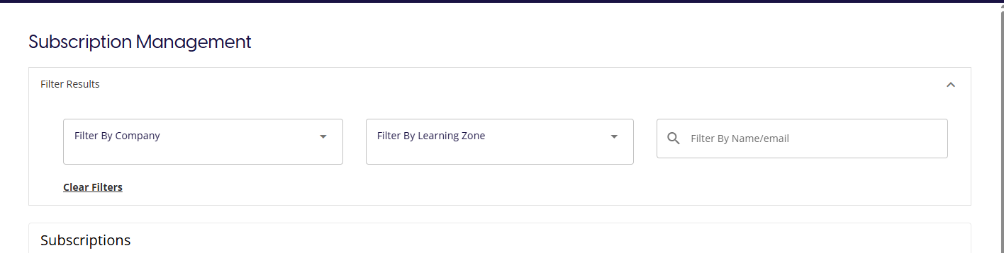 The Subscription management page allows you to view and manage the current subscriptions to any Learning Zone. You will be able to select any Learning Zone and alter any individuals access to that Learning Zone.