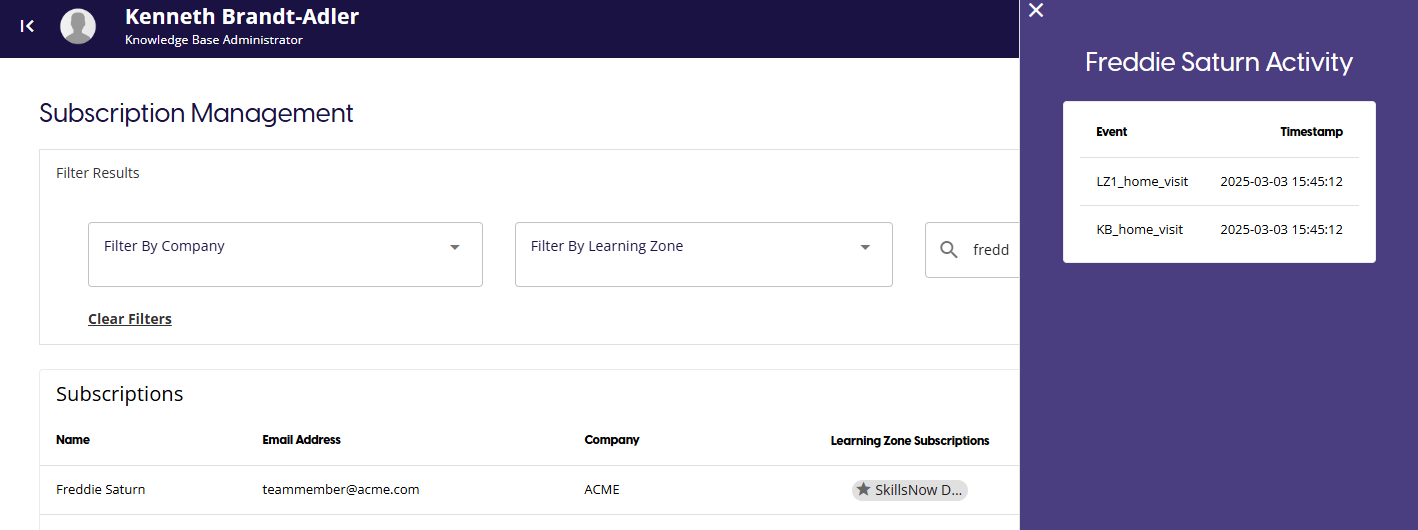 As a Knowledge Base Admin, I am able to view all User subscriptions so I can manage access to each learning zone.
