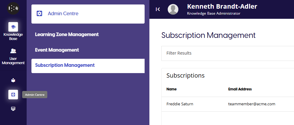 To access the Subscription Management page, first go to the Admin Centre in the Knowledge Base portal, then select the Subscription Management option from the left panel.