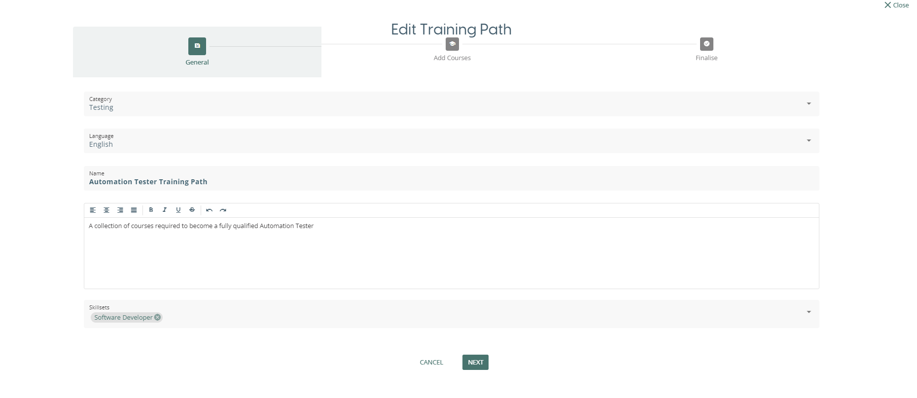 This will then open up the Training Path editor dialog on the General setting page, allowing you to start editing details of the training path. On the next page, you will be able to edit the courses associated with the training path, with the previously selected courses already checked. You can add or remove courses on this step.