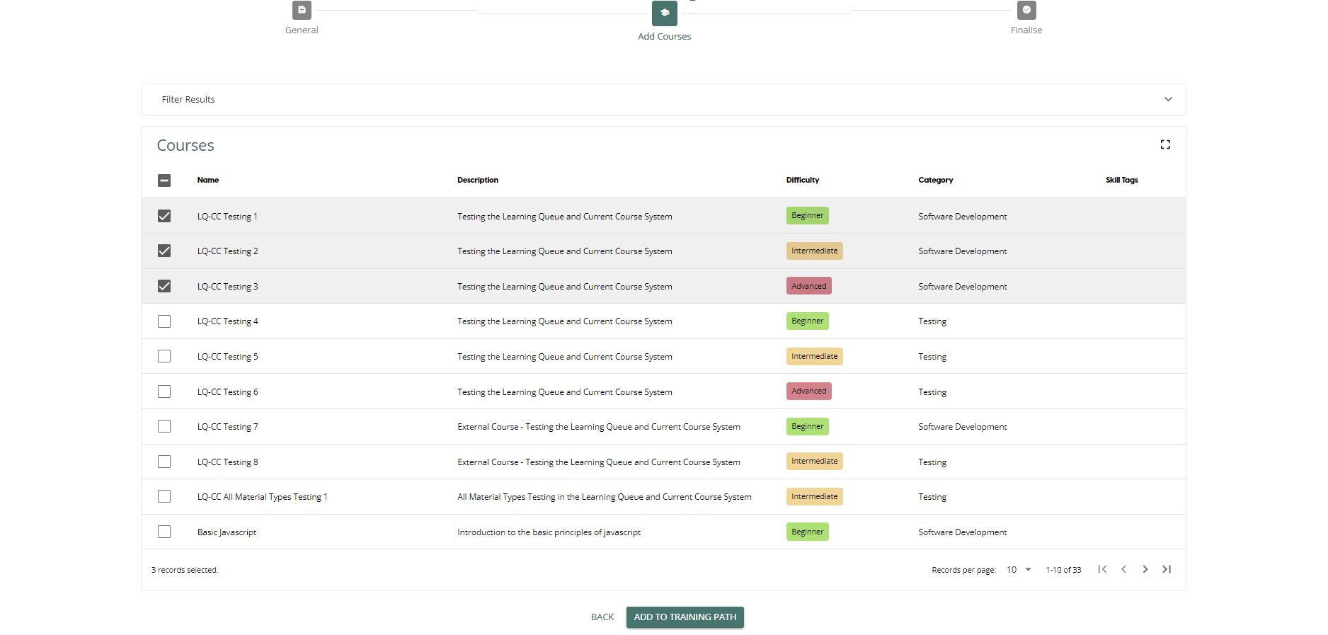 The next step in creating a training path is to assign courses to the path itself. The next view provides a list of the published courses. In order to add a course to a path, click on the course icon to select it and it will have a green tick to signify it has been selected. Clicking on the course again will untick it and remove it from the path. There is a Filter Results element that when clicked, expands to allow you to filter the courses in the view via different attributes.