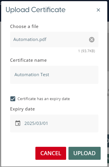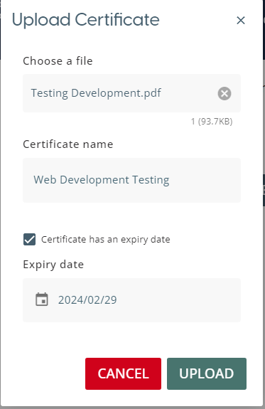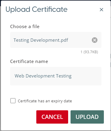 This will open a pop-up window which allows the user to select a file from their device to attach to the completed material. The certificate name field dictates how the file will appear to others when they view or download the file. This window also allows for an expiry date to be added by selecting the ‘Expiry Date’ checkbox.
