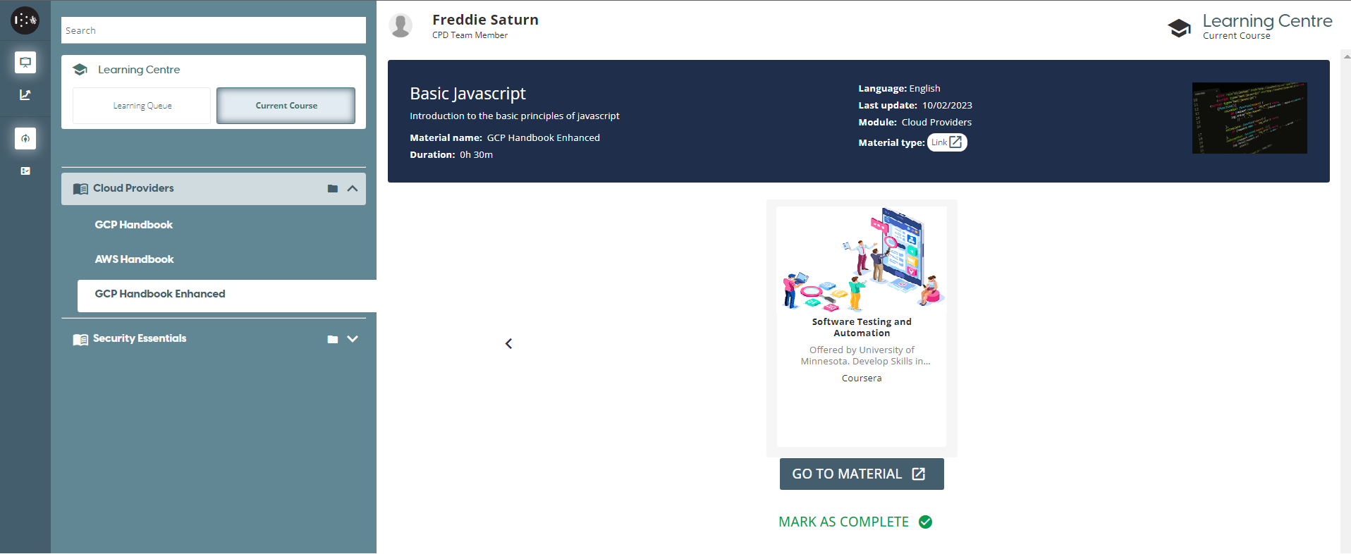 Once a user has finished an external course, they can check the course as completed and will be presented with a Save button to save their progress.