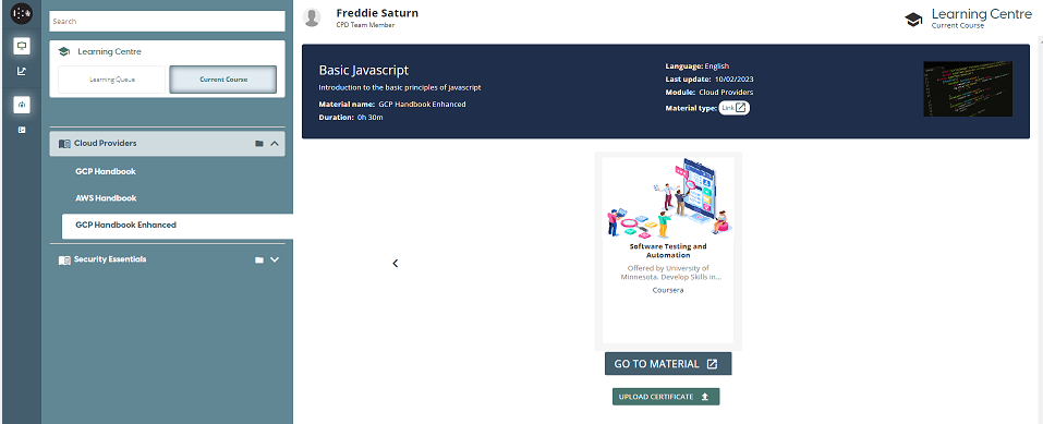 Proof of completion can also be uploaded against an external material within an internal course. Once an external material has been marked as complete, then on visiting the page again there will be a ‘Upload Certificate’ button