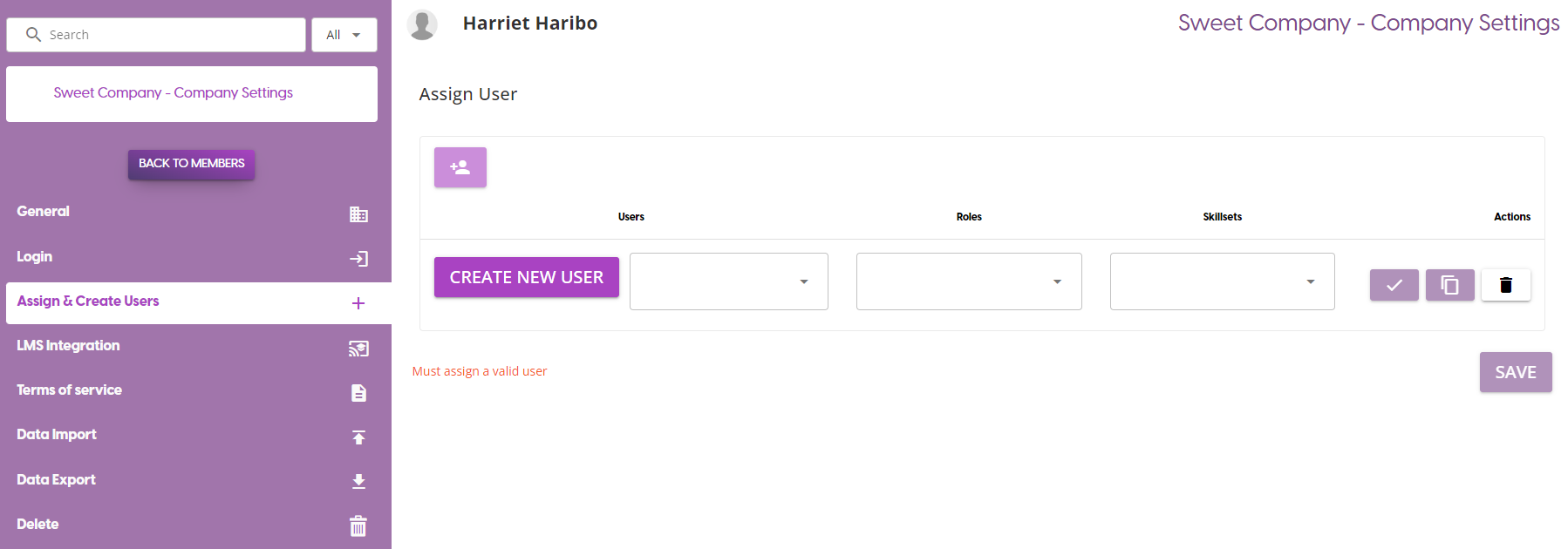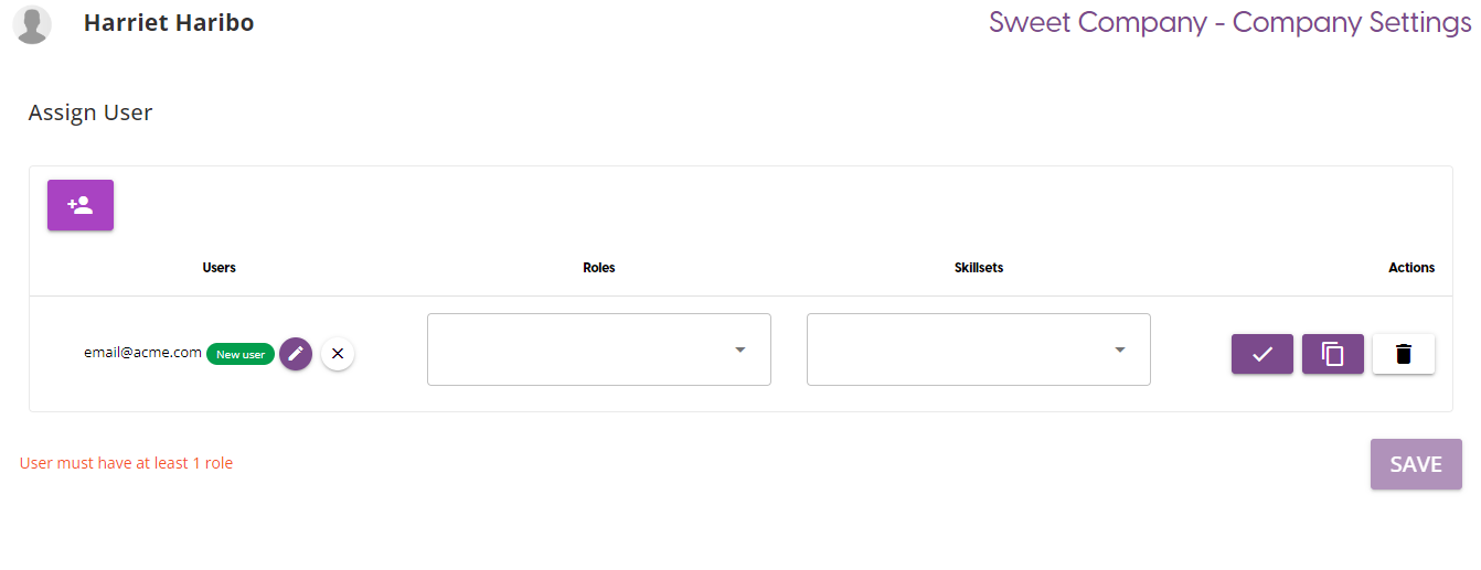 Once on this page, to add a new user row in the Assign User table, click on the Add User icon at the top of the table. This will give you the ability to create a new user, or to assign one to the group.