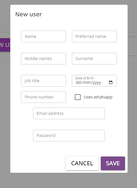 To create a new user, click on the Create New User button to open a window which allows you to enter the basic details of the new user.