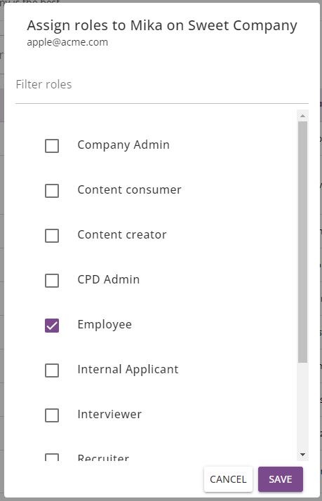 From this window, simply check or uncheck the roles you wish to add or remove, and once you are happy with the changes made click on the Save button. Otherwise, click on the Cancel button to undo any of the changes made. You can filter through the roles by typing in a search term into the Filter Roles search bar, which will update the list to show roles matching the search term.