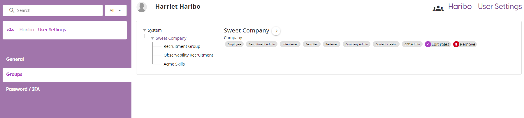 This page give you the same functionality as the 'Edit Roles' window from the Members table, allowing you to add and remove Roles from a user. However, this page also adds a tree model to give a visual representation of which Roles are applied at each level.