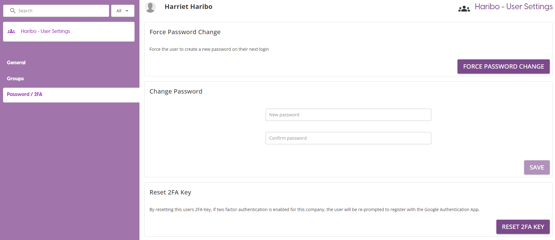 Reset 2FA Key: If 2FA is enabled for the company, this will reset the individuals authentication to allow them to re-register with the Google Authentication app.