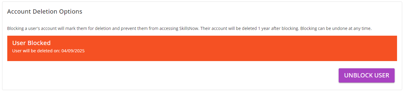 Account Deletion: Users cannot be deleted outright from the company as a company admin. Instead, you must first block the user via this page first. This will prevent the user from accessing SkillsNow, but will keep any information related to the user. After a year from the block date, the user will be deleted from the platform.
